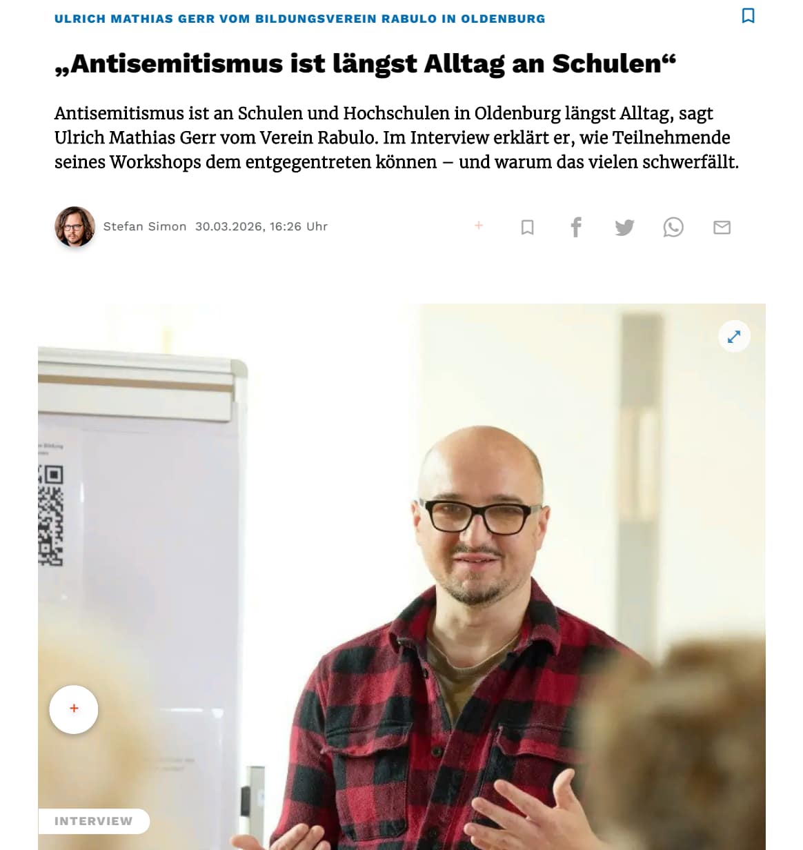 Im NWZ-Interview mit Stefan Simon stellt unser Vorsitzender Ulrich Mathias Gerr unsere am 10. April beginnende Fortbildung Reframe – Qualifizierung für antisemitismuskritische Bildung & Praxis vor und spricht über aktuelle Herausforderungen in Bezug auf Antisemitismus, insbesondere an Schulen und anderen Bildungseinrichtungen.